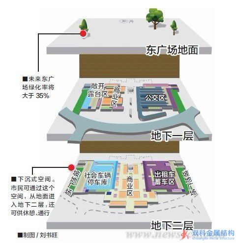 新客站東廣場效果1 石家莊新客站東廣場東西寬146米、南北長312米,總建筑面積6.7萬平方米。東廣場地下空間分為兩層,主要功能包括:公交站點(diǎn)、出租車蓄車、社會(huì)車輛停車、商業(yè)配套等功能,從而解決新客站的人流集散、交通換乘、商業(yè)購物等多方面需求。其中社會(huì)車輛停車位為243個(gè);商業(yè)及步行通道面積為24510.4平方米,商業(yè)與車庫中設(shè)備用房面積約4551.8平方米;衛(wèi)生間等的面積約7710平方米。 現(xiàn)場:新客站東廣場地下二層正在進(jìn)行頂板建設(shè) 近日,記者來到東廣場時(shí),工人們正在為一個(gè)已搭建起的空間捆扎頂部鋼筋。據(jù)負(fù)責(zé)該項(xiàng)目的中鐵十八局石家莊項(xiàng)目部工程部副部長杜飛介紹,現(xiàn)在裸露在外的這個(gè)內(nèi)部空間就是未來東廣場的地下二層。目前,東廣場的南北兩側(cè)都在進(jìn)行地下二層的頂板建設(shè)。 杜飛說,地下二層的層高南北不同,南側(cè)略高、北側(cè)略低,這樣的設(shè)計(jì)緣于功能劃分的不同。按設(shè)計(jì),南側(cè)地下二層主要用來停放社會(huì)車輛,北側(cè)地下二層則用來停放出租車。 東廣場地下除去公交車、私家車、出租車的停放空間,最令人期待的還有從此穿行的地鐵2號(hào)線、3號(hào)線。 根據(jù)規(guī)劃,地鐵石家莊站位于石家莊站東廣場下方,為雙線換乘站,地鐵3號(hào)線、地鐵2號(hào)線建好后,可在東廣場下方換乘。 記者走到東廣場施工中間部位,看到新客站東站房下方,一條東西走向的條狀鋼筋混凝土結(jié)構(gòu)地基初見雛形,工人們正在兩側(cè)的側(cè)墻上捆扎鋼筋。據(jù)杜飛說,此時(shí)記者近距離接觸的就是正在施工的地鐵3號(hào)線。 杜飛說,由于東站房支架還沒拆除,目前還不能進(jìn)行地鐵2號(hào)線施工。一旦支架拆除,2號(hào)線就馬上動(dòng)工。 進(jìn)度:地鐵3號(hào)線地基可見雛形 東廣場未來的交通除了有了專門的公交車、私家車以及出租車的充足地下空間外,最令人期待的還有地鐵2號(hào)線、3號(hào)線。根據(jù)規(guī)劃,地鐵石家莊站位于石家莊站東廣場下方,為雙線換乘站,在新客站東西走向的地鐵3號(hào)線和南北走向的地鐵2號(hào)線建好后,可在東廣場下方進(jìn)行換乘。 近日,記者順著陡坡進(jìn)入東廣場施工現(xiàn)場中間部位,看到在正對著新客站東站房的下面,一條東西走向的條狀鋼筋混凝土結(jié)構(gòu)地基初見雛形,工人們正在兩側(cè)的側(cè)墻上捆扎鋼筋。記者注意到,地基并不是平坦的,6條同樣走向的凸條將其分割。“這是地鐵3號(hào)線的位置,未來將有兩條軌道。”杜飛指著地基說。 他告訴記者,由于東站房支架還沒拆除,因此目前還不能進(jìn)行地鐵2號(hào)線施工。據(jù)悉,地鐵3號(hào)線在上,2號(hào)線在下。2號(hào)線位于石家莊新客站與東廣場之間,呈南北走向,為地下三層島式車站;而3號(hào)線位于石家莊站站房和東廣場地下停車場下,呈東西走向,與石家莊新客站和東廣場合建。 地鐵2號(hào)線從南北方向下穿新客站東廣場,長約200米;地鐵3號(hào)線從東西方向貫穿新客站,長約700米。旅客下火車后,不用出站就可以直接進(jìn)入地鐵站,這種“零換乘”的方式方便旅客乘車,四通八達(dá)的交通網(wǎng)也會(huì)緩解附近的道路通行壓力。 未來:東廣場南北各建一個(gè)坡地廣場 除了在交通方面更加便利外,未來將作為主廣場的東廣場在設(shè)計(jì)中也融入了更多的休閑因素。 記者注意到,在正施工的南北兩側(cè)地下二層低于地面的外圍施工現(xiàn)場,是一片平坦的土坡,看不到繁忙的施工場面。對此,杜飛指著外圍的土坡地告訴記者,這里將建一個(gè)坡地廣場。“坡地廣場也可以說是下沉式空間,市民可以通過這個(gè)空間從地面進(jìn)入地下二層。”這樣的坡地廣場在南北兩側(cè)各建一個(gè),每個(gè)面積大約在4000平方米左右,主要是供旅客休憩、通行使用。 據(jù)了解,新火車站東西廣場景觀設(shè)計(jì)各有特色,其中,已經(jīng)簡易投用的西廣場景觀特色為“水潤石門”,西廣場的設(shè)計(jì)方正而渾厚,象征了端莊大氣的石門古韻和源遠(yuǎn)流長的歷史脈絡(luò)。而未來的東廣場景觀特色為“行云流水”,代表城市的變化、發(fā)展和未來,集合東廣場集散交通功能,蘊(yùn)含八方來客匯聚于此,然后疏散至城市各處,有川流不息之意。東廣場面向主城區(qū)代表現(xiàn)代和時(shí)尚,傳達(dá)創(chuàng)新求變的時(shí)代氣息和多元包容的城市精神,將通過暢直通達(dá)的直線步行道,綠蔭繚繞的休憩廣場,波浪流轉(zhuǎn)的擋墻座椅,高低錯(cuò)落的流線花街,共同營造霓光艷影的水韻廣場。 按照規(guī)劃,作為主廣場的東廣場綠地率大于35%,同時(shí)配置軌道交通、長途客運(yùn)、公共交通、出租車、社會(huì)車設(shè)施,考慮市政配套、郵政電信、商業(yè)服務(wù)。 |