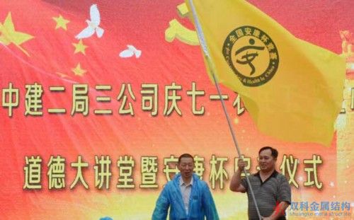 活動(dòng)過程中,中建二局三公司十堰萬(wàn)達(dá)項(xiàng)目部工地開展了慶“七一”農(nóng)民工“三心”(自信心、責(zé)任心、進(jìn)取心)道德教育,同時(shí)啟動(dòng)了2015年“安康杯”活動(dòng)。十堰市總工會(huì)對(duì)中建二局進(jìn)行了授旗。