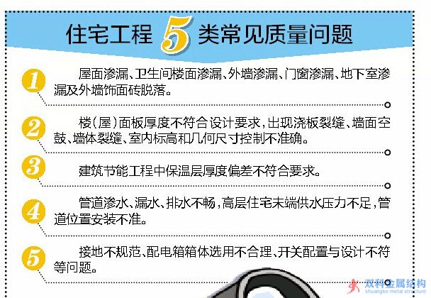自治區(qū)住建廳下文,要求通過實地調查和問卷形式,關注居民房屋質量問題 住建部門“問診” 看哪些房屋“帶病” ![]() 廣西新聞網-南國早報記者 徐慶成 房屋質量問題,備受老百姓關注。4月21日,記者從自治區(qū)住建廳獲悉,該廳日前下發(fā)《關于開展2015年住宅工程質量常見問題問卷調查工作的通知》,要求全區(qū)各市城鄉(xiāng)建委和房產主管部門通過實地調查和問卷,到居民區(qū)里開展住宅工程質量常見問題治理 各地視情況選擇小區(qū)調查 近年來,廣西建設工程的總體水平逐年提高,但住宅常見質量問題依然存在。記者從南寧市城鄉(xiāng)建設部門了解到,去年該市質監(jiān)站收到的房屋質量投訴中,關于滲漏和開裂的投訴,包括門窗、外墻、管道等屋內設施滲漏及公共部分滲漏、墻面裂縫等,還有不少投訴涉及交房條件不符合要求等問題。 按照《通知》要求,各設區(qū)市、縣(市、區(qū))住房城鄉(xiāng)建設委(局)或房產主管部門,將選取2013年1月1日以后竣工驗收的4~5個住宅小區(qū),采取實地調查和發(fā)放問卷方式進行。選取的住宅小區(qū)將包含不同結構類型,入住率在60%以上;設區(qū)市的每個住宅小區(qū)總戶數不宜少于300戶,縣(市、區(qū))每個住宅小區(qū)總戶數不宜少于100戶。當轄區(qū)內的住宅小區(qū)規(guī)模確實無法滿足上述要求時,各地可視情況選擇適宜的小區(qū)開展問卷調查。 問卷在發(fā)放一周內回收 自治區(qū)住房和城鄉(xiāng)建設廳有關負責人表示,房屋常見質量問題受設計、建筑材料、施工管理、自然環(huán)境等多種因素影響,雖不影響主體結構安全,但會影響到房屋外觀和正常使用功能。此次問卷調查,由住宅小區(qū)的物業(yè)(運營)單位統一發(fā)放《住宅工程用戶滿意度問卷調查表》,發(fā)放后在一周內回收。 各地住建、房管部門要向物業(yè)(運營)單位詢問住戶反映的主要質量問題,如外墻滲水、地下室滲水、廚衛(wèi)滲水、屋面滲水、窗臺或窗邊滲水、樓地面裂縫、給排水管道滲漏、開關插座接線錯誤、室內凈高不足等,對2014年接到的住宅工程用戶投訴進行分類統計。并根據問卷統計情況,有選擇性入戶進行實地調查。 業(yè)主收房時先進行檢查 自治區(qū)住房和城鄉(xiāng)建設廳有關負責人表示,市民遇到住宅質量方面的任何問題,都可以向廣西質監(jiān)總站或者當地的質監(jiān)站咨詢或投訴。按照規(guī)定,房屋在竣工并經相關部門驗收合格后才能交付使用。購房者在收房和裝修時,把好質量關很重要。業(yè)主在收房時,應細心查看開發(fā)商必須提供的材料是否完善,確認房屋具備交付條件。 住建部門提醒,為避免可能因裝修或后期施工破壞等導致的質量問題責任界定不清,業(yè)主在收房時應對住宅室內觀感和使用功能方面質量狀況進行檢查,包括對衛(wèi)生間及其他有防水要求的房間地面進行24小時蓄水試驗,檢查外墻、外窗、衛(wèi)生間、管道是否滲漏,房間空間尺寸和觀感是否符合要求等。此外,業(yè)主還應依據購房合同,查驗開發(fā)商是否實現對供水、供電、供熱、燃氣、通訊、道路、綠化等配套設施的交付承諾。 住宅工程5類常見質量問題 1 屋面滲漏、衛(wèi)生間樓面滲漏、外墻滲漏、門窗滲漏、地下室滲漏及外墻飾面磚脫落。 2 樓(屋)面板厚度不符合設計要求,出現澆板裂縫、墻面空鼓、墻體裂縫、室內標高和幾何尺寸控制不準確。 3 建筑節(jié)能工程中保溫層厚度偏差不符合要求。 4 管道滲水、漏水、排水不暢,高層住宅末端供水壓力不足,管道位置安裝不準。 5 接地不規(guī)范、配電箱箱體選用不合理、開關配置與設計不符等問題。 |